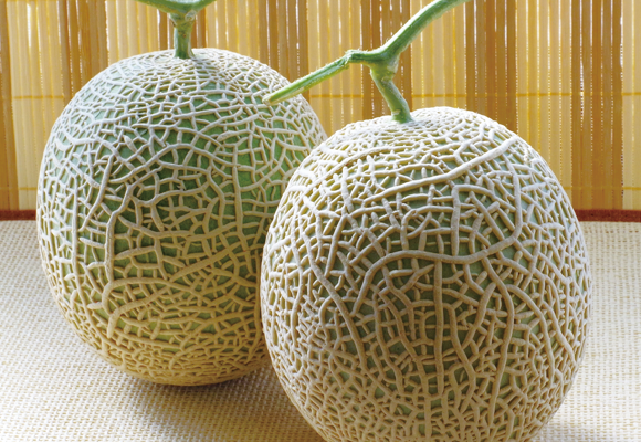 むねかた農園では高級品種のアールメロンと、人気の高いアムスメロンを作っています。2品種とも緑肉メロンで香り良く、ジューシーで上品な甘みが特長です。