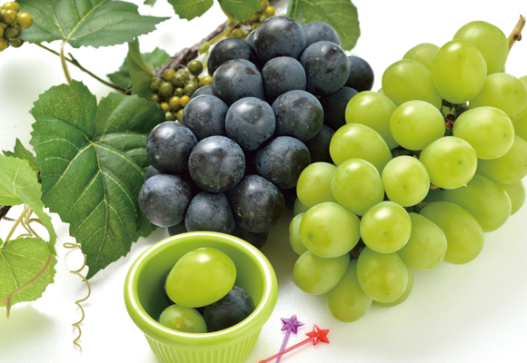 ぶどうにはアントシアニン等のポリフェノールが含まれ、コレステロールの酸化防止、心臓病予防、がん予防に効果があると言われています。特にぶどうの皮とその直下にポリフェノール、発がんを抑制するレスベラトロールという物質が含まれるという報告があり、できれば皮ごと食べることで、がん予防に効果があると言われています。